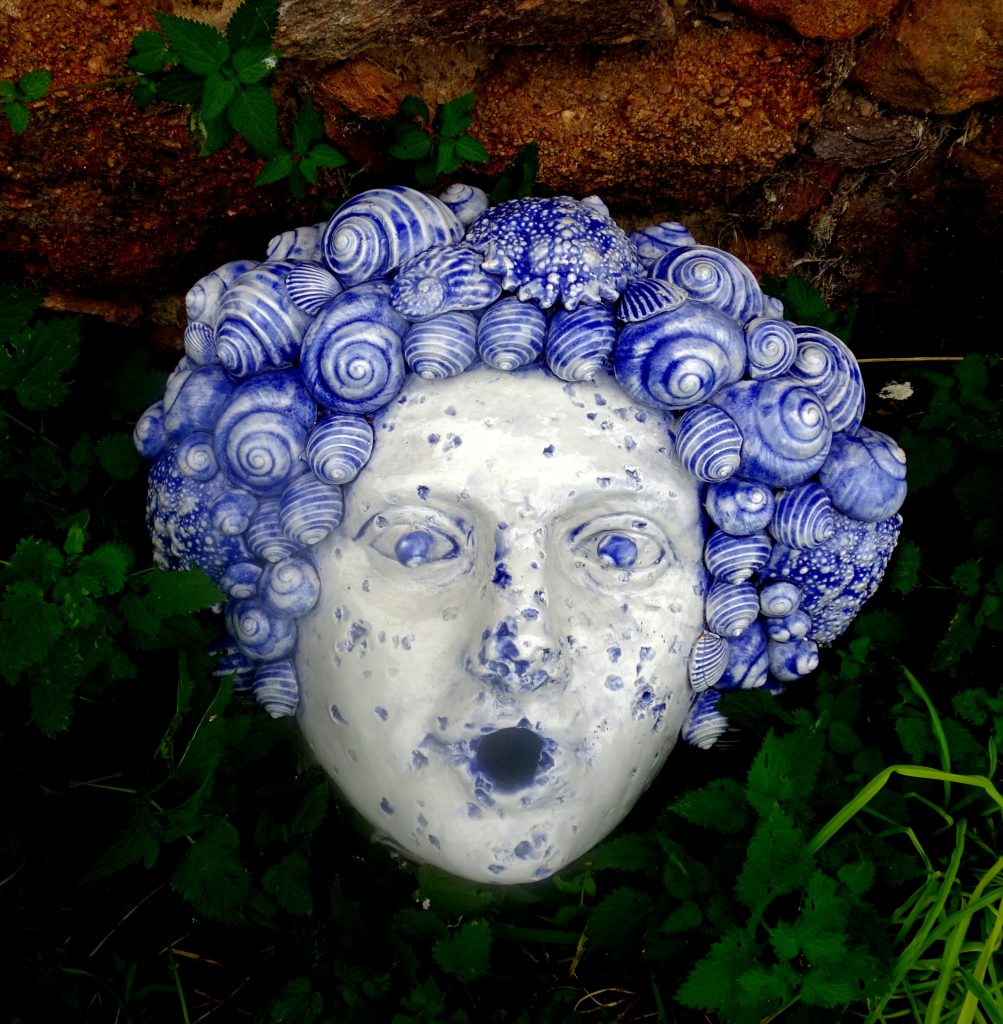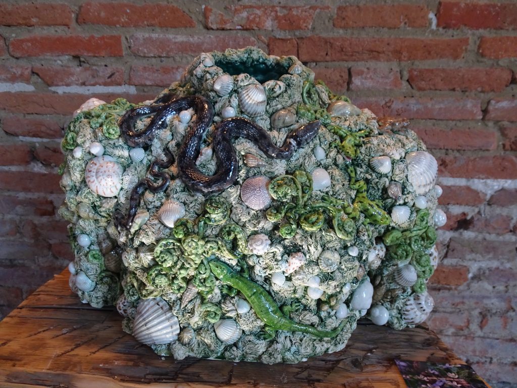 Autodidacte, Gisèle Garric explore la faïence depuis près de trente ans. Son univers, profondément naturaliste et baroque, s’inscrit dans une filiation assumée avec Bernard Palissy, dont elle prolonge l’esprit sans jamais l’imiter. À travers un travail minutieux de moulage, elle prélève l’empreinte du réel : végétaux, coquillages, fruits, mais aussi objets industriels ou rebuts du quotidien – pneus, claviers, déchets alimentaires. Ces fragments, une fois transposés dans l’argile et l’émail, deviennent motifs, reliefs, paysages.